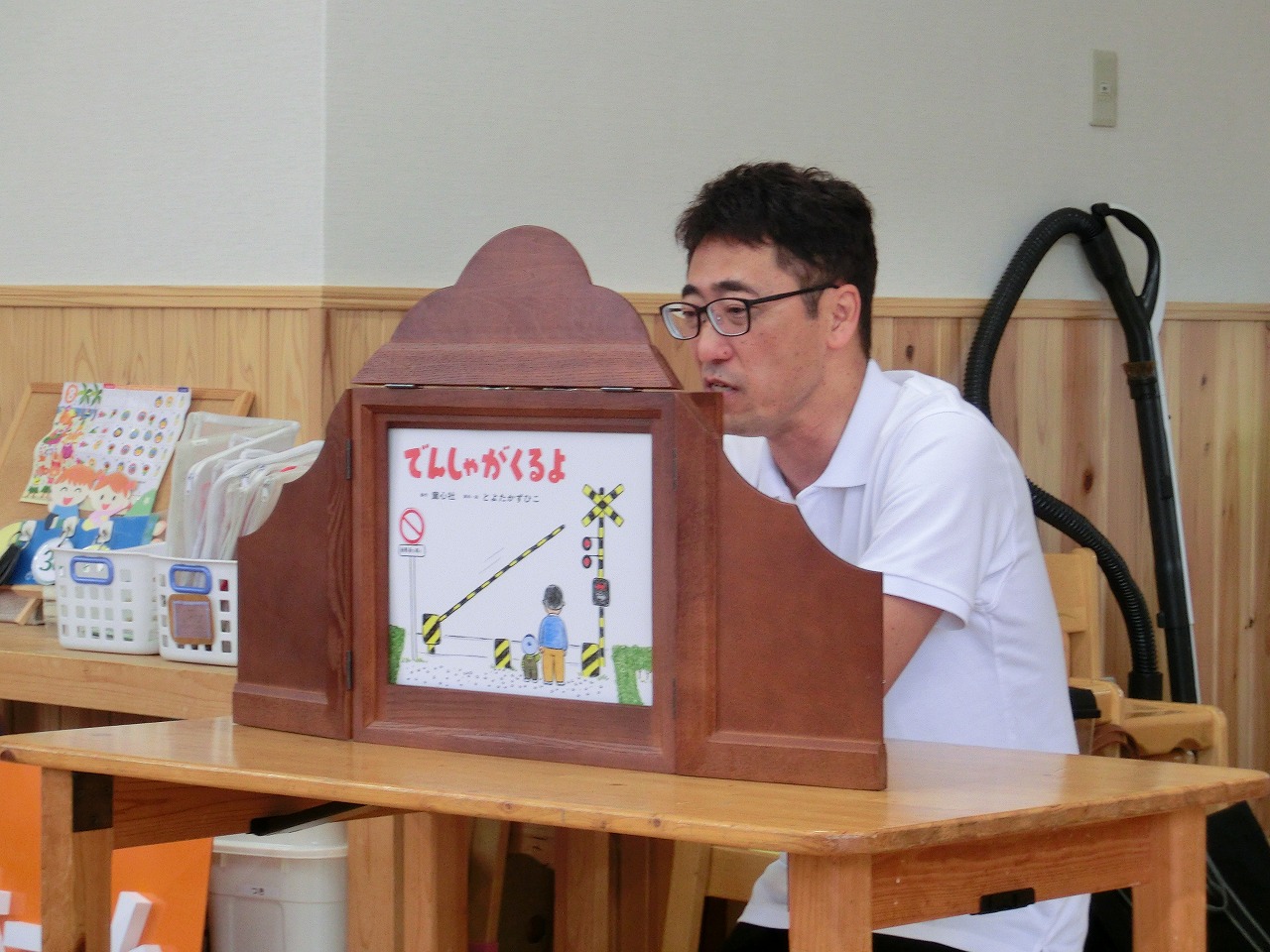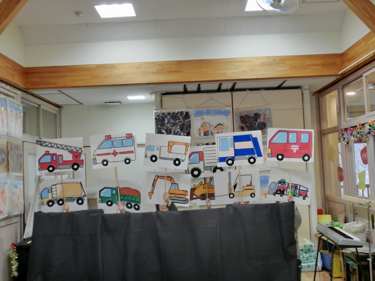 ペープサート「はたらくくるま」では、歌に合わせていろんな車が登場し、みんなで大合唱!