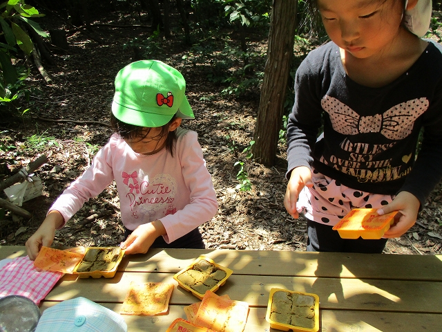 園舎で材料を切って、小袋に詰めて裏山へ!