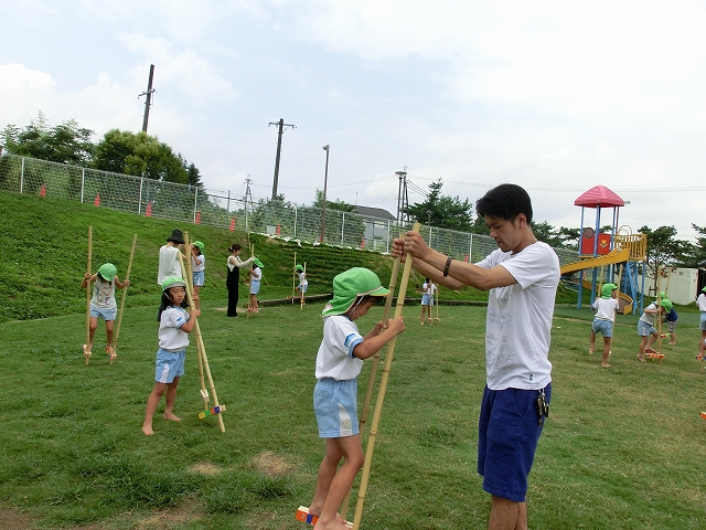天然芝の上だから、裸足で練習する竹馬も痛がったり、怖がることもなく