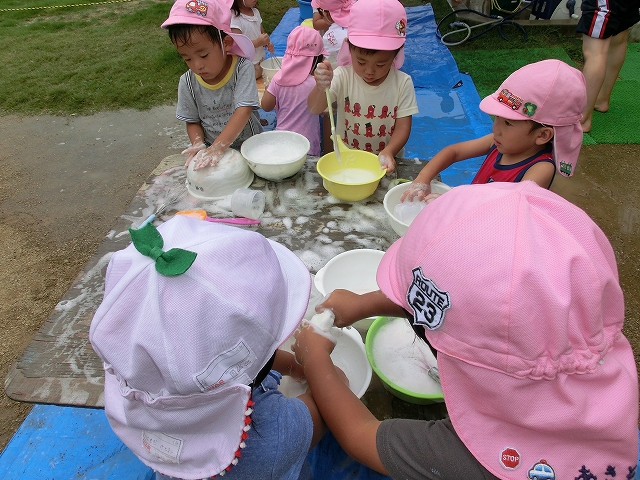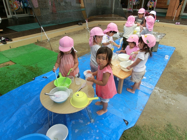 頑張る5歳児の横では、2歳児さんが、楽しく泡遊びしている。