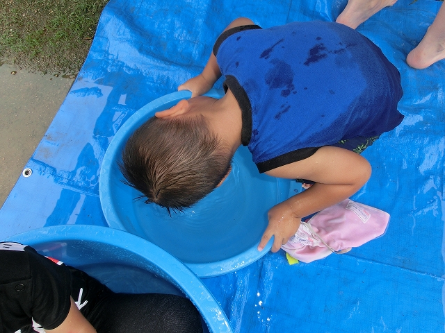 中には、タライにはった水の中に頭をつけてニッコリの子どももいたり