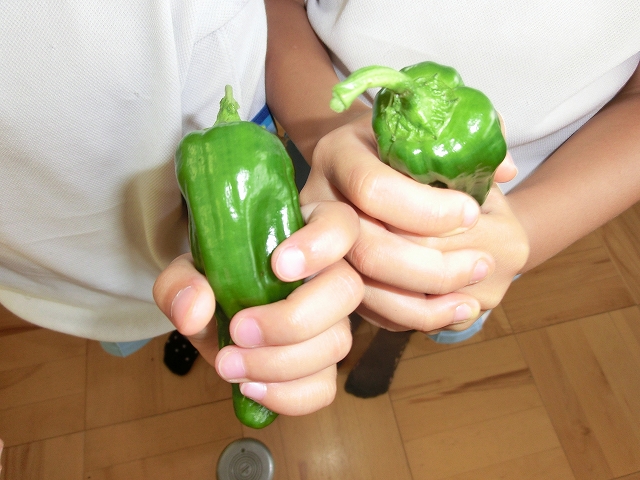 園舎横の畑では、キュウリやナス、ピーマンが育ち、収穫を楽しんでいる子ども達。