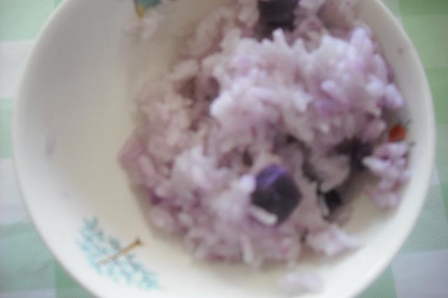 ご飯が紫色に変身!! もちろん、味は普通に甘くておいしかったけど。