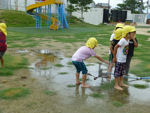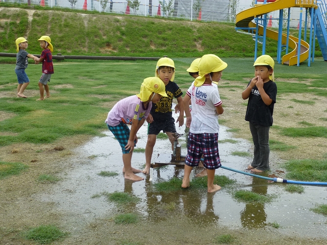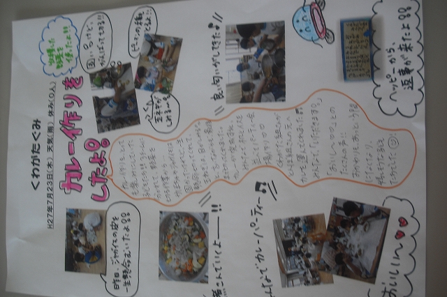 本当なら、16~17日はくわがた組さんのお泊り保育でしたが、 台風の接近の為に延期になりました。 今日もまた、裏山で野外炊飯のカレーを作る予定でしたが、今日も雨! なんと、雨にかち合ってしまうくわがた組さん・・・ それでも、保育園で収獲した玉ねぎ・ジャガイモ、ピーマン、ナスの入ったカレーに 大満足の子ども達でした。 子ども達と作るから失敗できないと何日も前からカレーの箱(裏に材料が書いてある)と にらめっこしていたM先生の書いた日刊より・・・