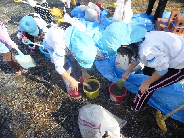 ①納品された砂をバケツに入れ運べるように準備する