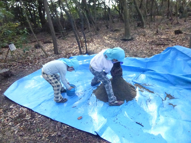 子ども達が運んだ砂でかまどの基礎を業者の方に据えてもらい、
