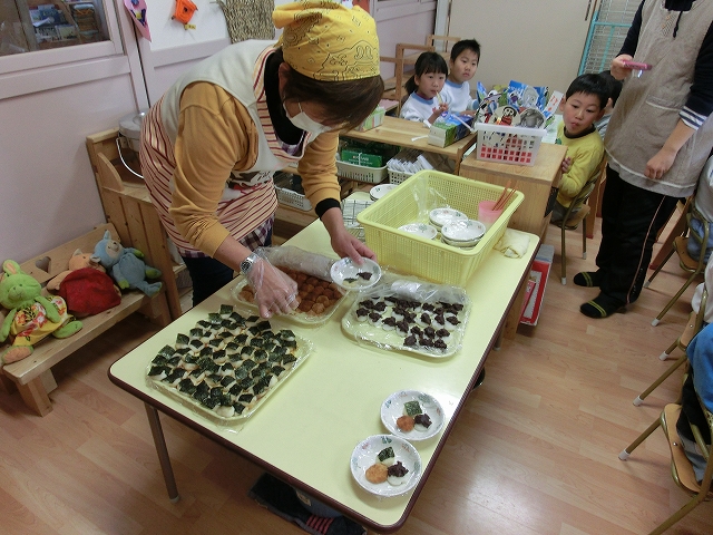 子ども達にエプロンつけて、手指を消毒しておもちをつかせるだけでも時間がかかます。