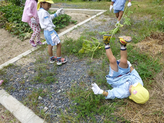 5歳児さんと収穫に行きました。男の子たちは我先にと収穫していくのに、