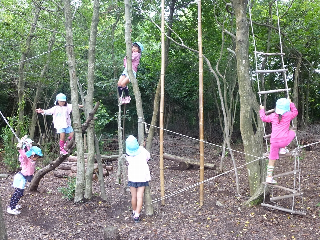 「こっちまでおいで!」とフープくぐりやお山を登りに誘導する親御さんを