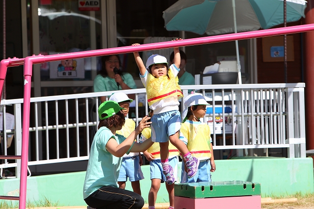 を大きな声で伝え、園庭に設置した3M位の竹竿を登る競技です。