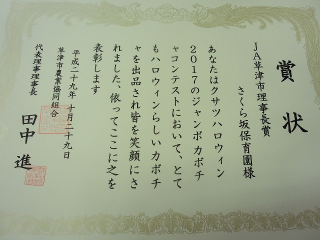 草津市で開催された「おばけかぼちゃコンテスト」で、農協理事長賞を