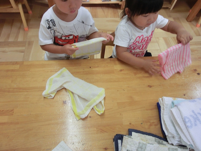 7時15分出勤したので、2歳児さんと洗濯物たたみをしました。