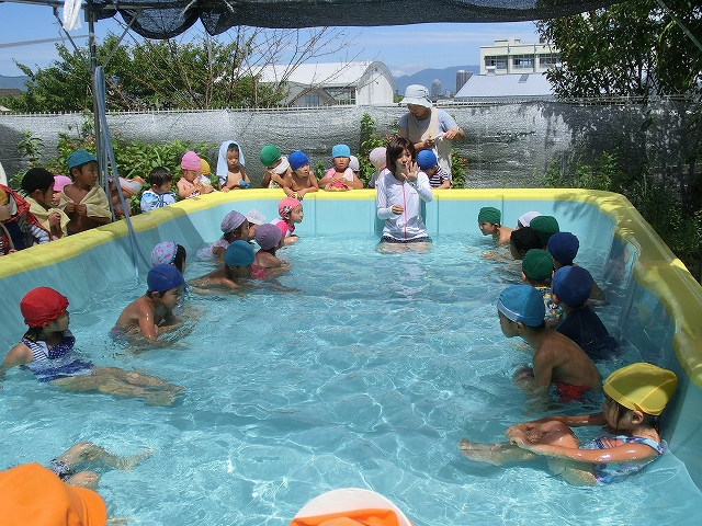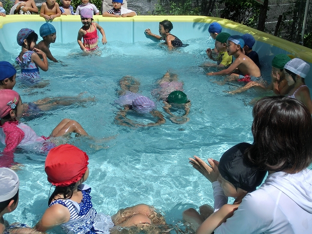 その後、 2歳児さんのプールの後のシャワーを手伝い、プールバックを個別の場所に