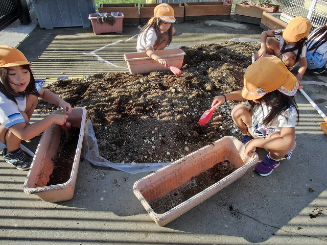 まずは、土をプランターに入れる作業