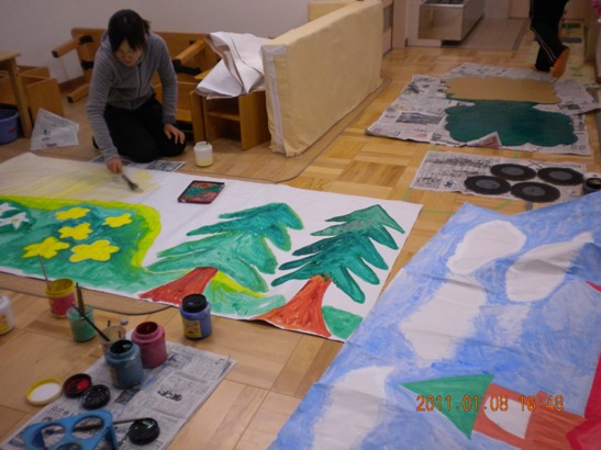 会議の後は各クラスに分かれて劇遊びの背景作り。